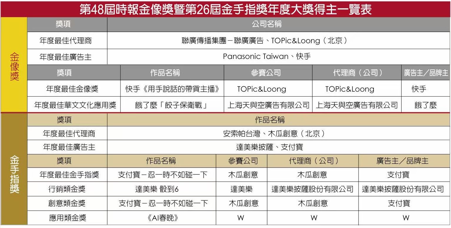 第48屆時報金像獎總決審於橫琴舉辦,邀請11位專業代表組成評審團,最終選出6個年度大獎及多項金銀銅獎。TOPic&Loong憑〈快手-用手說話的帶貨主播〉拿下年度最佳金像獎與最佳代理商。早期由台灣到北京發展的創意人龍傑琦表示:「從公益到AI,我們走了6年。雖然艱辛,但能用AI講述人性故事,提升品牌社會價值,值得。」台灣聯廣廣告表現亮麗,並列年度最佳代理商;最佳華文文化應用獎由上海天與空〈餓了麼-餃子保衛戰〉獲得。