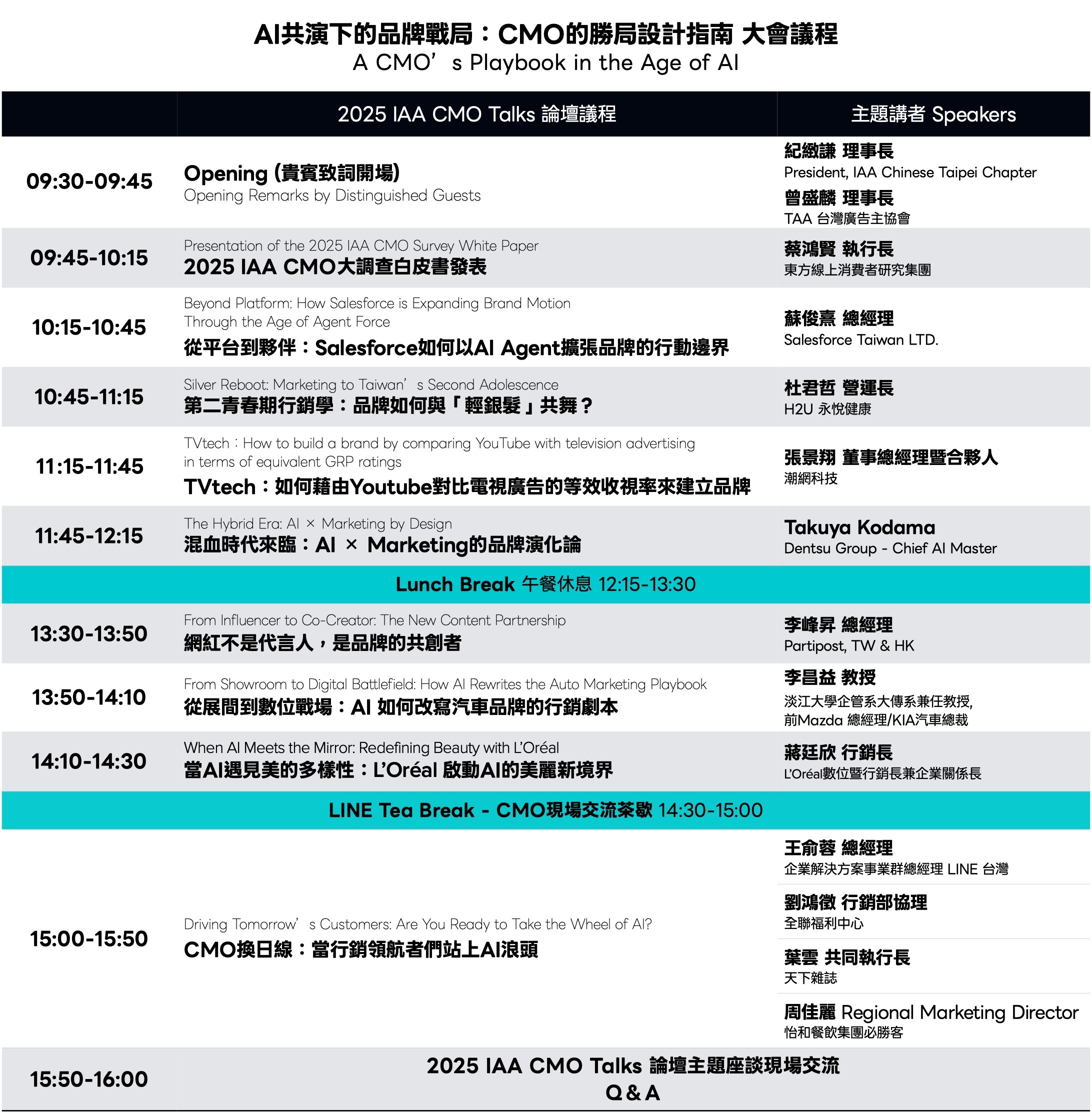 由IAA國際廣告協會台北分會與Salesforce、LINE聯合舉辦、TAA台灣廣告主協會協辦的年度盛會 - 第三屆「2025 IAA CMO Talks 論壇」,將以「AI共演下的品牌戰局:CMO的勝局設計指南」為主題,於10月22日隆重登場。論壇將於台北寒舍艾美酒店舉辦一整天的高密度論壇議程,集結全球趨勢、在地洞察與第一線實戰經驗,打造行銷領域最具策略高度的專業交流平台。
