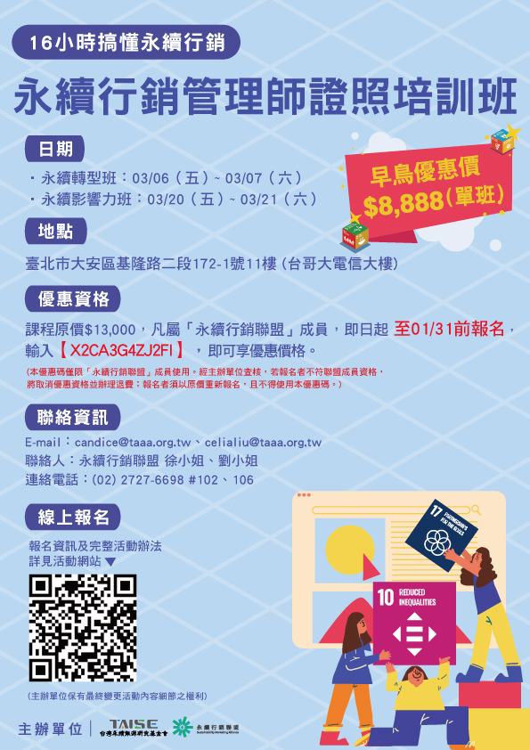 永續行銷聯盟與TAISE台灣永續能源研究基金會攜手,開辦「永續行銷管理師證照培訓班」,兩大主題班「永續轉型班」、「永續影響力班」,每班16小時,邀請產學界翹楚擔任講師,不藏私的專題分享與實務討論,適合所有行銷傳播產業人才來學習。