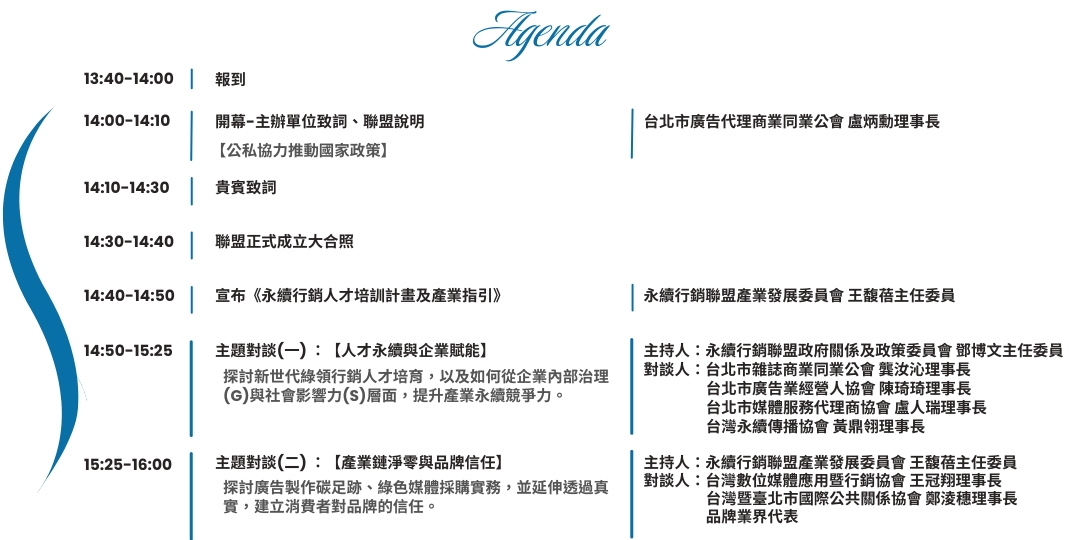 我們將於 114年12月26日(五) 假 政大公企中心 舉行成立大會。會中除正式宣告聯盟成立外,更將發布兩項重大產業建設,全方位探討台灣產業永續行銷發展,期能透過公私協力,為台灣建立永續商業環境。