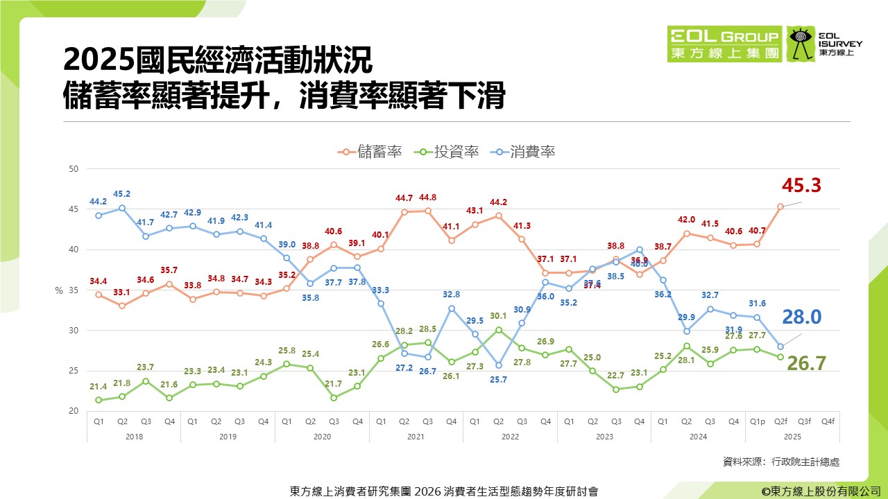 2025年台灣總體經濟數據亮眼,整體景氣欣欣向榮,股市更屢創新高,但這樣的榮景,卻沒有反映在消費的行為上,2025年的消費率與投資率均來到近三年新低,而儲蓄率則創下了近八年新高,整體經濟狀況呈現外熱內冷,整體環境的不確定,包括對等關稅、地緣政治、通膨壓力等,導致消費者的消費行為轉趨保守,更多的是想把錢存起來。