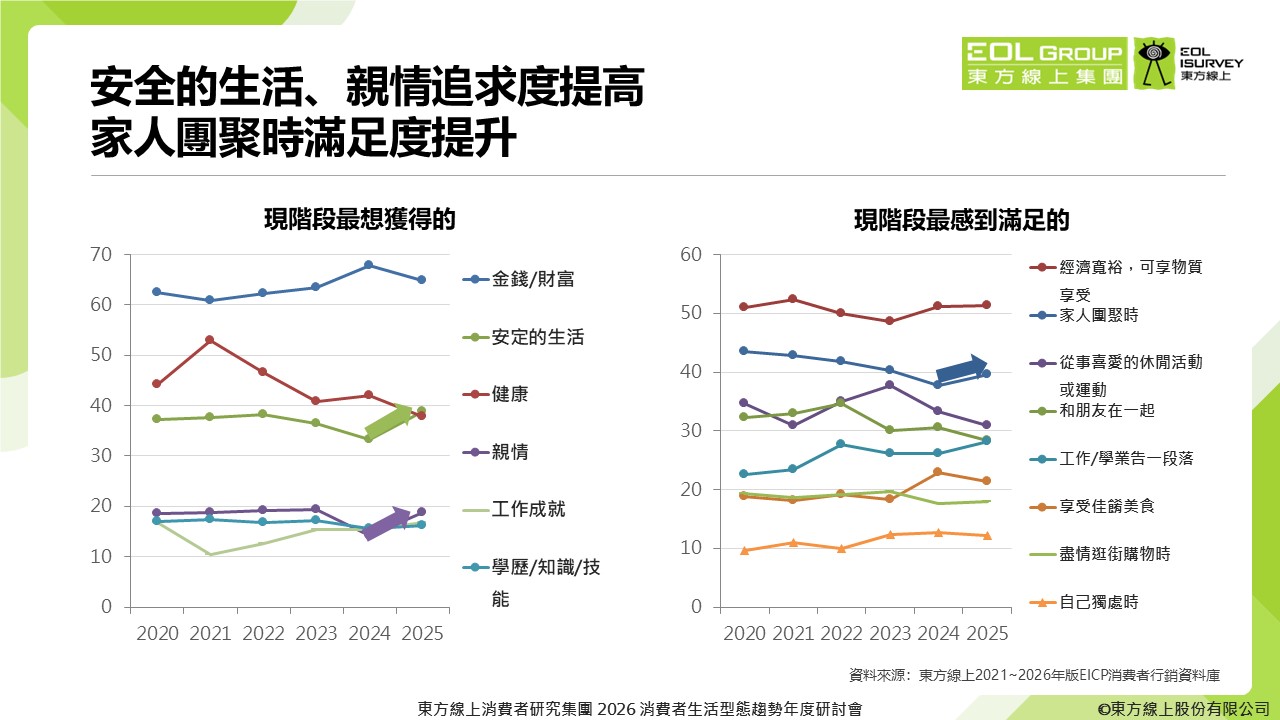 而在內外環境不穩定的影響下,我們近一步發現,在金錢、健康、安定、親情、工作成就、學歷/知識/技能六項裡,「金錢」雖然仍為消費者最想獲得的,但相較於2025年,其比例有所下降,消費者反而在安定的生活與親情的追求度上有所提升,而在與家人團聚時感受到的滿足感也有提升,可以發現,在不確定環境下,消費者會回歸家庭,而穩定生活則是他們所期待的。