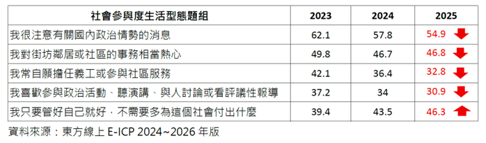 而在這樣的狀況下,消費行為會產生出什麼樣的變化呢?政大企管系特聘教授別蓮蒂對此提出了「靜默消費」的概念,所謂靜默消費指的是一種被不確定性震盪出的冷漠與求穩,消費者會呈現出一種看短、看近、看當下的態度,此刻的安穩勝過未來的精采,我們以社會參與度為例,民眾的社會參度呈現快速的下滑,在政治活動、社區事務、義工服務的參與度都有所下降,認為只要過好自己生活就好的比例則有46.3%,為近三年新高。