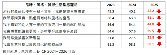 而在消費行為部分,消費者欠缺消費信心,致使在消費的態度與行為上則轉趨保守,尤其在對於品味、風格與質感的追求度上,根據東方線上E-ICP 2024~2026年版資料顯示,整體品味、風格、質感的追求,在近三年均呈現下降的現象。