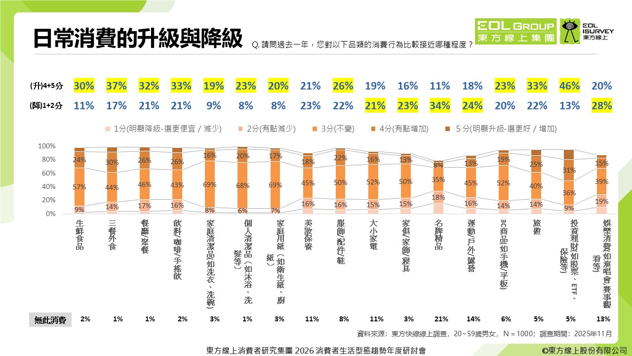 根據東方線上2025年11月的調查,進一步爬梳消費者在不同品類的消費行為後,東方線上副總經理蘇湘婷發現消費者對消費價值進行了重新分類,出現了一種必需品升級,而非必需品降級的現象,在必需用品,如生鮮食品、個人清潔品、餐飲/飲料、家庭用品等,出現消費升級現象(選更好的或增加);相對的,在非必需品,如名牌精品、娛樂消費、運動/戶外/露營等品類則呈現消費降級的狀況(選便宜的或減少),而這一現象也證明了消費者的精明消費模式,而這些在必需品上的小小升級,則顯現了一種消費價值觀重新分類的意義。