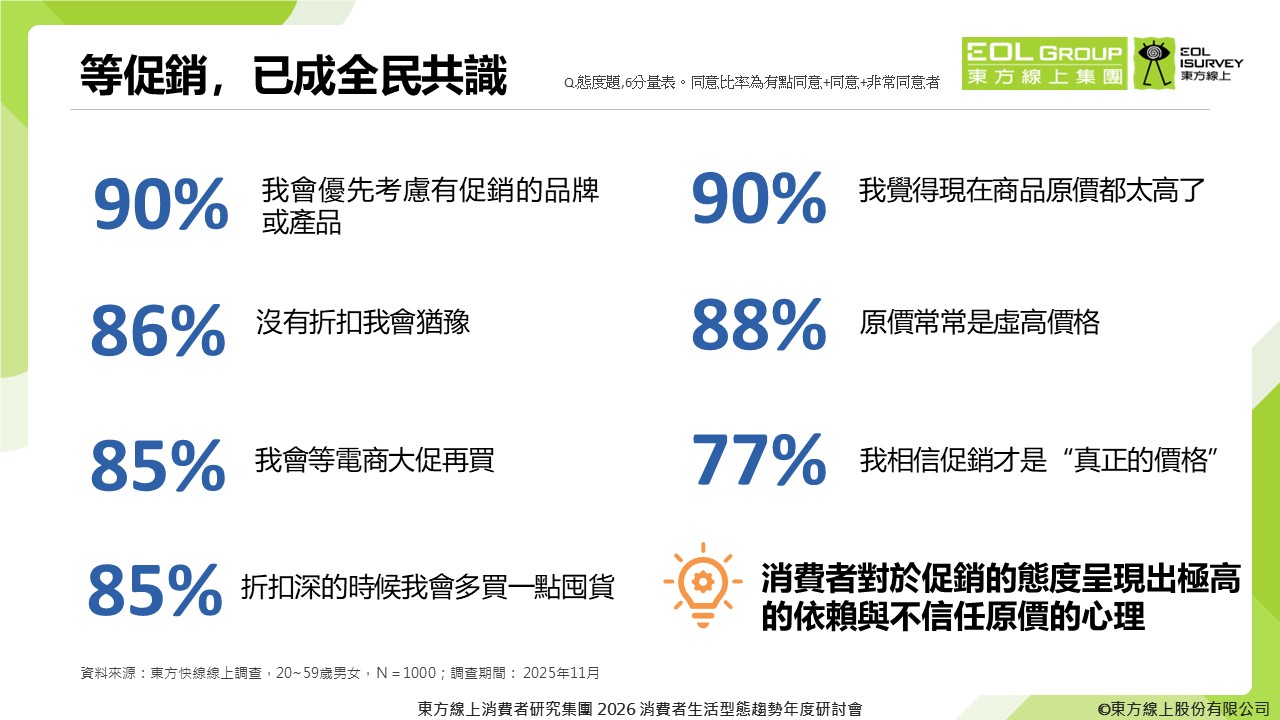 此外,消費者更加務實與精明還呈現在另一個部份,亦即消費者會靜靜等待,等到一個最好的時機才出手購買,所謂的最好時機,並非只有價格,它取決於消費者對於產品/服務價值的綜合評斷,而促銷,則是其中一個十分具有代表性的時機,東方線上2025年11月的調查,東方線上副總經理蘇湘婷指出,消費者有著促銷成癮的現象,而零售通路可預測性的促銷檔期安排,更加速了此一現象的成型,消費者因為能夠預期通路何時會促銷,因此他們才會等待,這樣的結果導致消費者對於促銷的態度呈現出極高的依賴與不信任原價的心理。