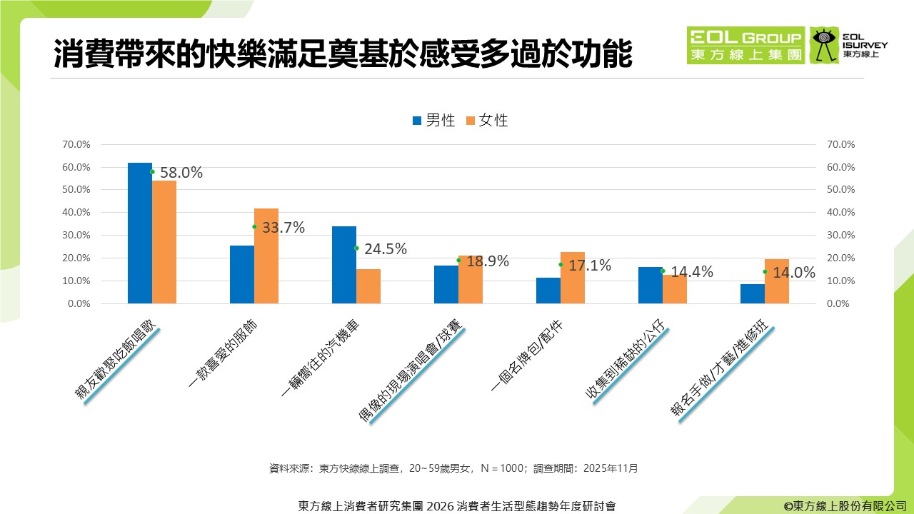 2026年會是什麼樣的趨勢?知名消費者生活型態與消費市場研究顧問-東方線上消費者研究集團,於12/18舉辦「2026東方線上生活型態趨勢研討會—這是一場從效率到感性的時代轉向:低耗降速 感性激活」,公布最新消費數據並解析市場趨勢。「低耗降速」成為消費者日常生活的常態,而「感性激活」則表現出消費者樂於追求各種不同體驗的特性,此外,消費者在日常消費行為上更出現一種重新分類的現象,小奢侈勝過大奢侈,但在體驗的追求上,則是更為勇敢、更為積極。