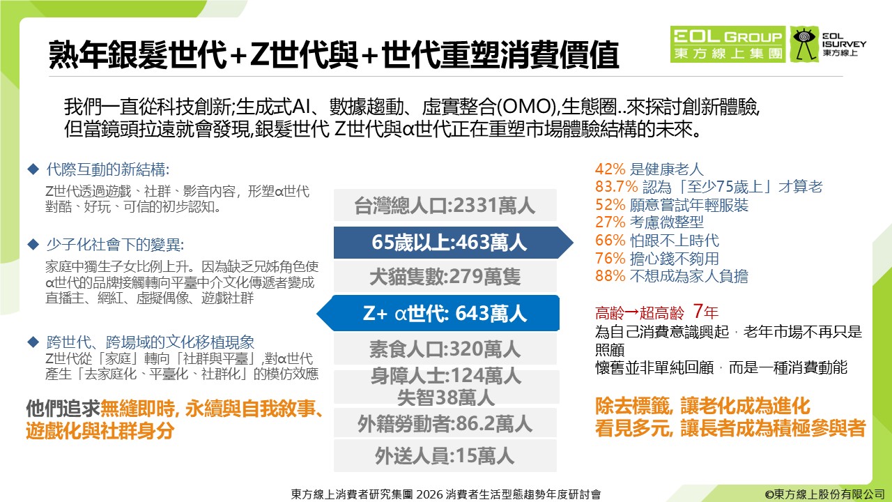 東方線上執行長蔡鴻賢觀察到,台灣目前正處於新社會重構的階段,當Z世代準備成家立業,X世代開始思考退休,當不同的世代開始進入不同的年齡,面對不同的生活挑戰,世代間的差異可能將會改變我們以往對於年齡的定義,這樣的改變將會是巨大且未知的。面對這樣的改變,除了調整自己的固有看法與認知外,更重要的是要持續的了解並掌握消費者的真實改變,在這條探索未知的旅程中,東方線上將持續與各位攜手前行。